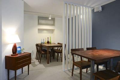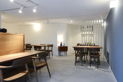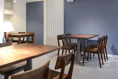 コンクリートの床に白い壁と天井、ワンポイントで青を使ったシンプルでお洒落な店内には、ウォールナットで統一された家具が並びます。