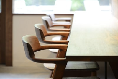 奥のテーブル席には板座のシンプルなデザインのチェアを選んで頂きました。板座にしたことで、より樹の風合いが際立っています。