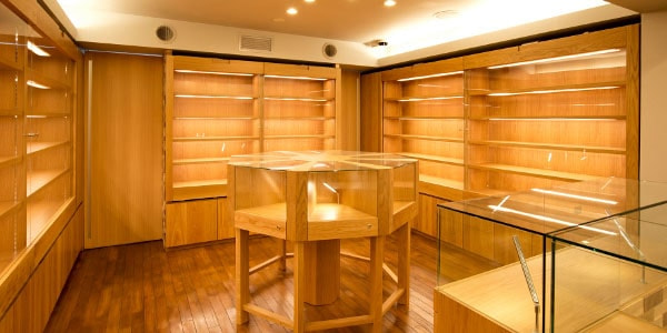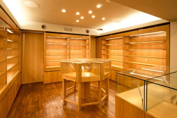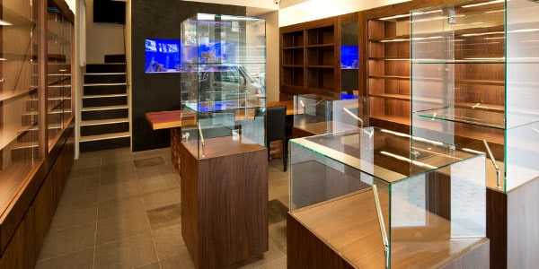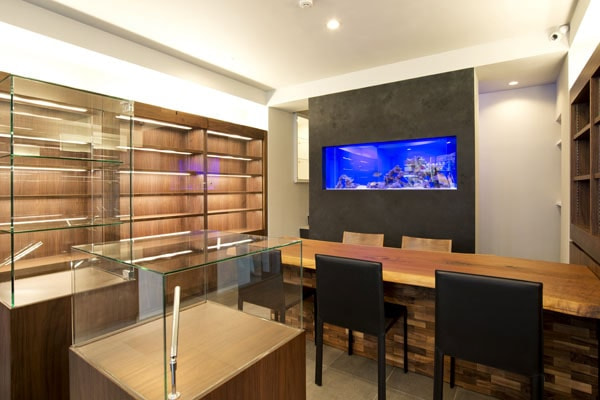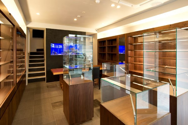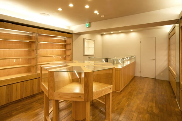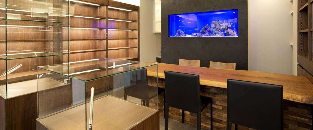 1階フロアは高級感あふれるウォールナットをふんだんに使いコーディネートさせていただきました。「ウォールナットと高級時計が双方を引き立たせる」ことをコンセプトに空間設計いたしました。