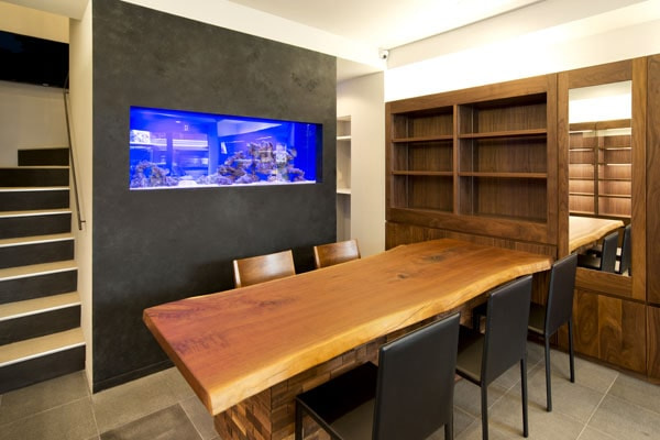 1階フロアの奥にあるウォールナット一枚板が存在感を放っています。カウンターの内側がお客様側から見えてしまわないように、脚部分を壁形状にして目隠しにしました。また脚部分にウォールナット無垢材をタイル状に貼り、やわらかな雰囲気を出しています。総革張りのチェアと、カウンター奥に配置された大型水槽が、高級感あふれる美しさを演出します。