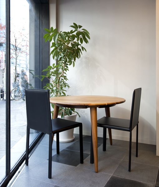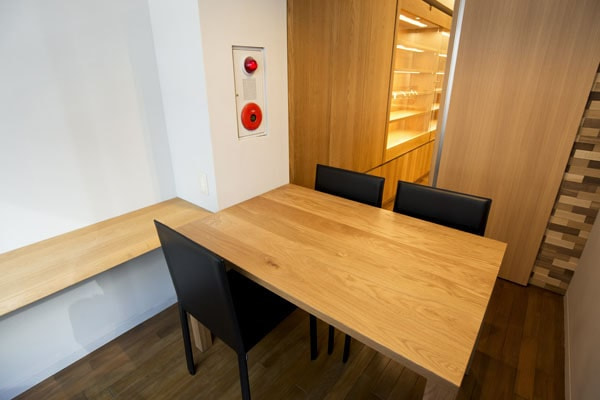 入口脇の小さな空きスペースを待ち合いスペースに。小さいながらも、ゆったりと寛いでいただけます。インテリアグリーンとウォールナット無垢材ベースのダイニングテーブルが心を和ませます。総革張りのスリムなチェアで高級感をプラスしました。