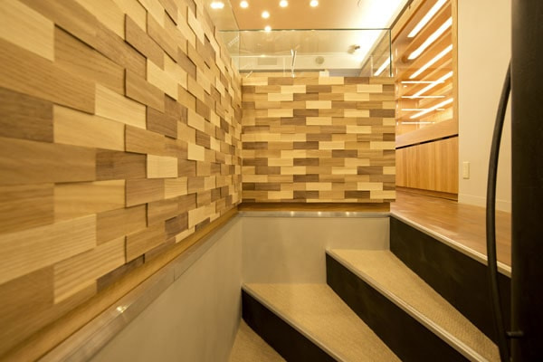 2階フロアへの階段を上がると、モザイク状に貼られたウォールナット無垢材、ナラ無垢材、タモ無垢材が目を惹きます。それぞれの無垢材を、一枚一枚全体のバランスを勘案しつつ、丁寧に構成しました。