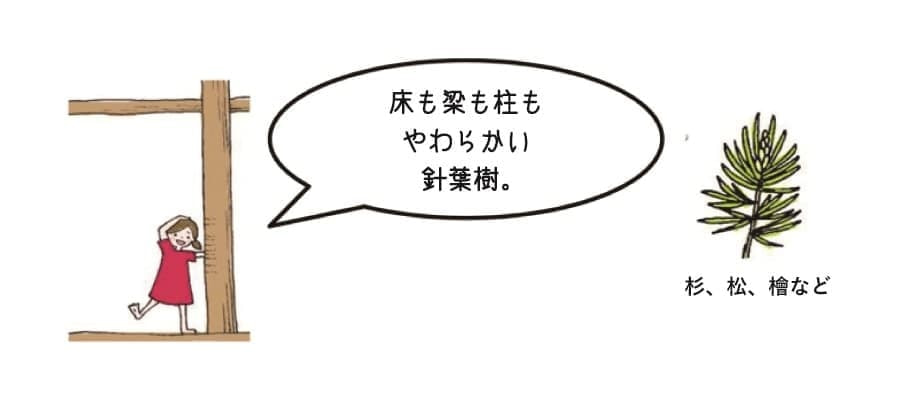 針のような細い葉をもつ針葉樹。木そのものはまっすぐ伸びるのが特徴です。細胞と細胞の間に含まれる空気の割合が多いため、 軽く、柔らかく育ちます。まっすぐ伸びる特徴を活かして、まだ電動工具がなかった時代には「軽くて、切り出しやすい」という 理由から住宅の柱や梁(ハリ)に多く使われ、大活躍しました。また靴を脱ぐ日本の住宅では、廊下にもよく使われました。