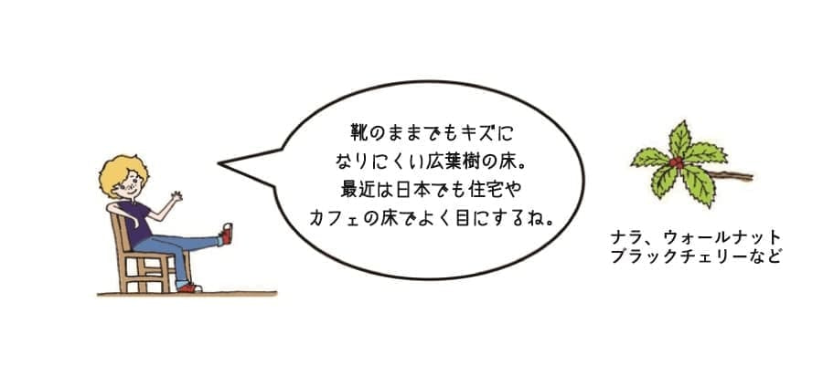細胞と細胞の間に含まれる空気が少ないため、木は重く、硬くなります。強度があり傷がつきにくいことから、内装材の他にも、 靴を履いたまま過ごす欧米では広葉樹を床材に使用していました。現在は多くの無垢材家具に「広葉樹」が使用されています。