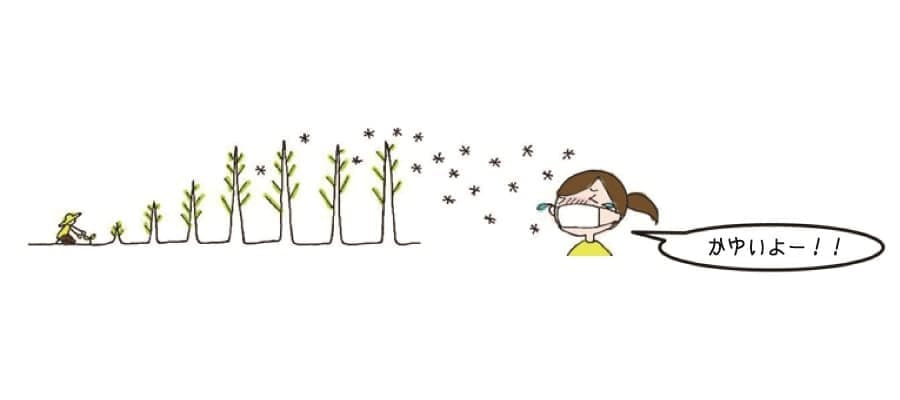 戦争が終わり高度成長期が始まると、戦後復興のため、たくさんの木材が伐採され、採り尽くした何もない山にはすぐに育つ杉や ヒノキ(針葉樹)が植えられました。これが後に多くの人々を悩ませる花粉症につながります。