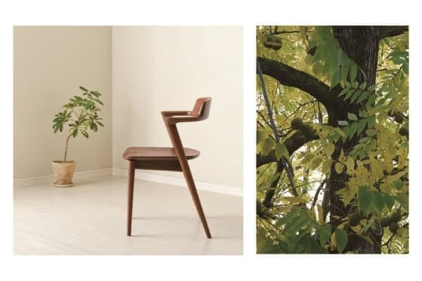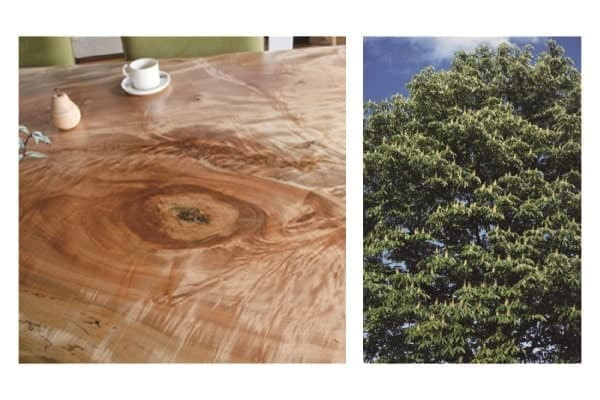色合いは赤味を帯びた黄白色と淡黄褐色で、木肌は緻密で絹布のような光沢感があります。 板目に表れるリップルマークと呼ばれる漣(さざなみ)状の木目が特徴です。 家具の他には、お椀やお盆などとしてよく使われています。 曲がりながら、時にはねじれながら伸びていく栃の木。迫力満点で大変人気があります。