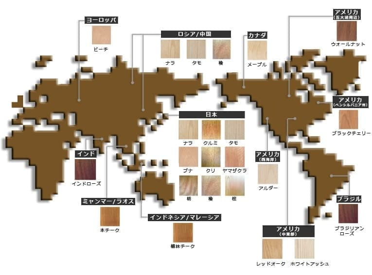 世界三大銘木のひとつとして有名なウォールナット。強度があり、狂いが少なく、 重厚感と高級感ある色味の木目で、とても人気が高い木材です。時間が経つにつれ、 だんだん色味が薄くなっていく点が特徴的です。家具の他に、楽器のハープや、 拳銃の銃床、アメリカ大統領の演説台などに使われることで有名です。
